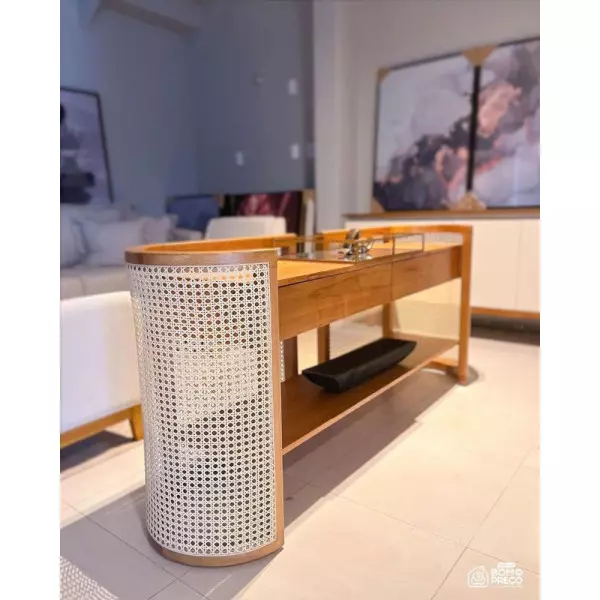 Esse modelo possui a estrutura em madeira tauari seca em estufa e imunizada, e detalhes com telinha (rattan sextavado), as gavetas e prateleiras são em MDF, laminados com madeira maciça. Não perca tempo e compre já o seu aparador!!