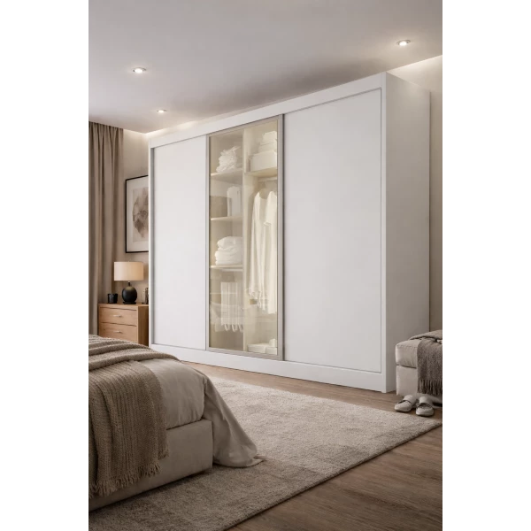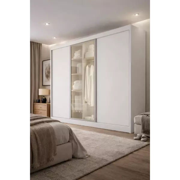 Guarda-roupa ultra moderno, pensado para quem busca um quarto clean, elegante e com estética de alto padrão. As portas de correr trazem praticidade e aproveitamento inteligente do espaço, com um acabamento sofisticado que valoriza o ambiente.