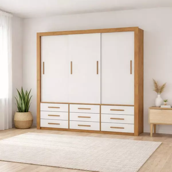 O Guarda-Roupa Imperium, com 3 portas de correr, conta com uma praticidade com Sua estrutura interna bem distribuída permite uma organização eficiente das roupas e acessórios, oferecendo mais visibilidade e aproveitamento do espaço. Com amplo espaço interno, o Guarda-Roupa Imperium dispõe de maleiros ideais para armazenar itens maiores como malas, cobertores, edredons e outros objetos volumosos. Seus três cabideiros são resistentes e perfeitos para pendurar camisas, calças, vestidos, sobretudos e diversas outras peças. As roldanas em aço e o trilho em alumínio garantem um deslizamento suave e seguro das portas, aliando durabilidade, funcionalidade e sofisticação em um único móvel.