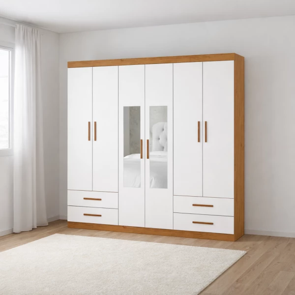 O Guarda-Roupa Grand – Grand Line foi desenvolvido para quem busca praticidade, organização e um toque de elegância no quarto. Com 6 portas e o diferencial de ter 2 espelhos centrais, ele é ideal para ambientes que precisam de melhor aproveitamento de espaço.