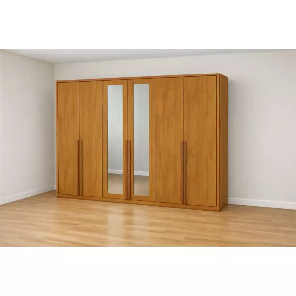 Guarda-roupa moderno e funcional, ideal para quem busca organização, elegância e praticidade no quarto. Possui 6 portas, sendo 2 portas centrais com espelhos, que ampliam visualmente o ambiente e trazem mais praticidade para o dia a dia.