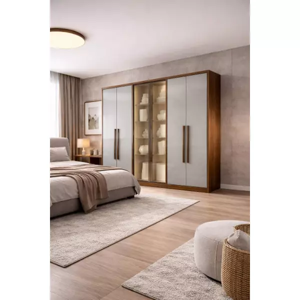 Guarda-Roupa Vitrine Glass é a escolha ideal para quem quer quarto clean, moderno e bem organizado, com aquele visual de “vitrine” que valoriza o ambiente. Com 6 portas, sendo duas Reflecta GLASS e 8 gavetas, ele oferece excelente capacidade interna para roupas dobradas, peças longas e acessórios, deixando tudo no lugar e fácil de visualizar no dia a dia. As portas com acabamento em glass dão um toque sofisticado e elevam a sensação de elegância, perfeito para compor um quarto mais chique e contemporâneo.