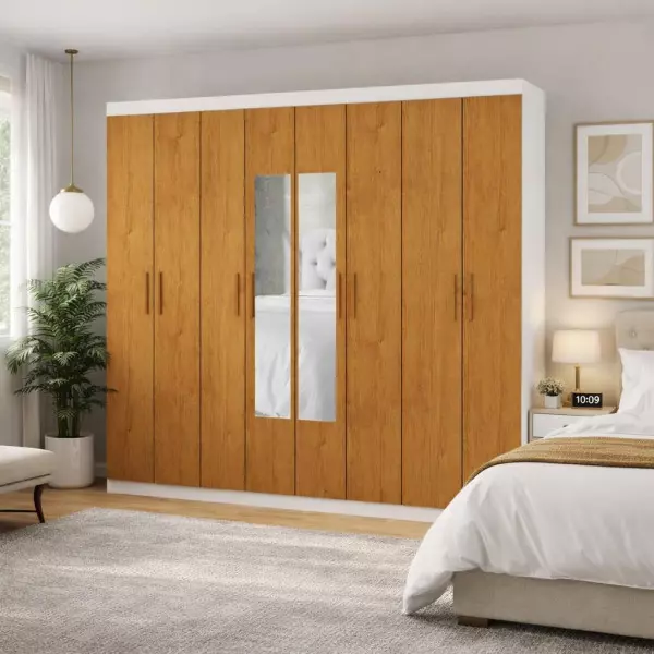 Com um design moderno e funcional, ele conta com 8 portas, gavetas espaçosas, prateleiras bem distribuídas, espelho central e um excelente espaço para cabides, garantindo uma organização prática para roupas, acessórios e objetos pessoais.