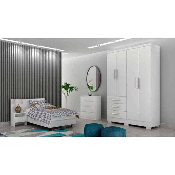O Guarda Roupa Encant vai proporcionar um ambiente aconchegante mantendo um visual sofisticado e funcional. Composto por peças de extrema qualidade e com excelente espaço interno bem distribuídos, oferecendo máxima organização de forma prática. Fabricado em 100% MDP, 4 portas de bater. Possui 3 gavetas com corrediças telescópicas, cabideiros em alumínio. Amplo espaço interno. Aproveite!