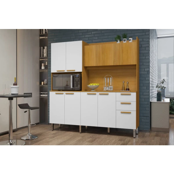 Você nunca imaginou que sua cozinha pudesse ficar tão bonita e organizada. Com esta Cozinha Jean, o espaço fica ainda mais convidativo e sempre pronto para te ajudar a preparar pratos incríveis, com corrediças telescópicas que proporcionam uma melhor abertura da gaveta, espaço para micro-ondas, pés cromados com regulagem de altura e puxadores em madeira. Confeccionado com materiais de resistência e qualidade, ele é a melhor opção para completar seu lar. Aproveite, você merece!