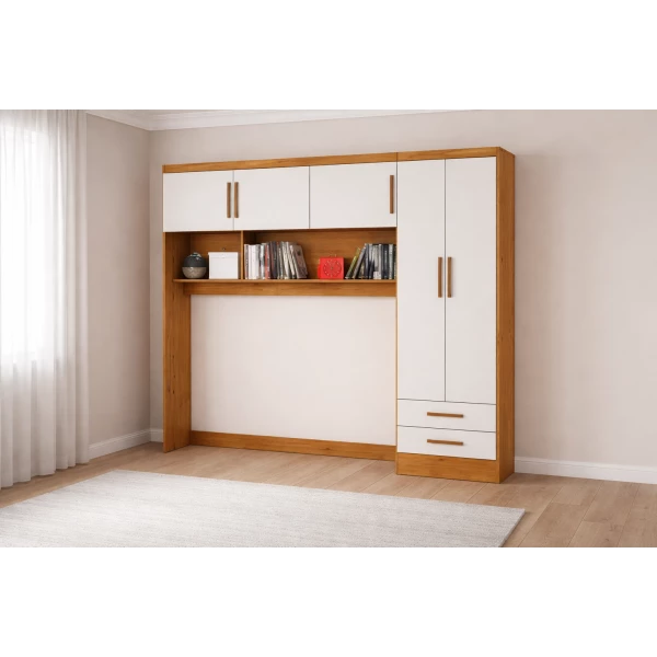 O módulo aéreo amplia o aproveitamento vertical do ambiente, sendo perfeito para quartos compactos ou para quem precisa de mais espaço sem abrir mão de um visual moderno e organizado. As gavetas são ideais para peças menores, enquanto as portas mantêm tudo protegido e alinhado ao design do ambiente.