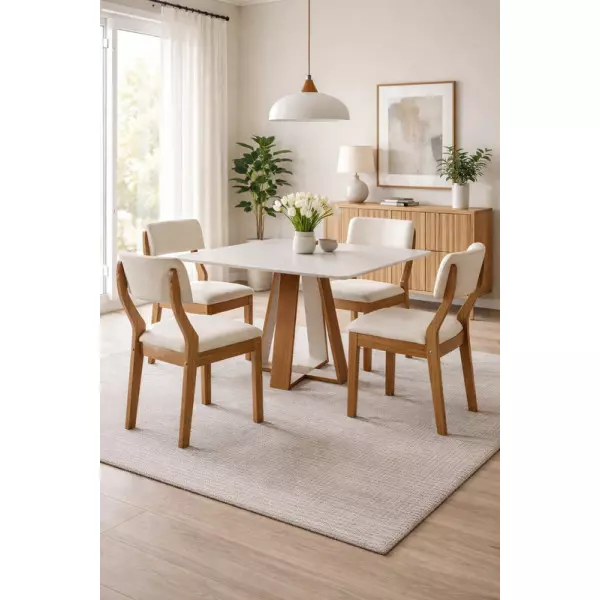 Transforme sua sala de jantar em um ambiente elegante e acolhedor com este sofisticado conjunto composto por mesa de jantar e 4 cadeiras estofadas. O design contemporâneo combina perfeitamente com diferentes estilos de decoração, trazendo charme, conforto e funcionalidade para o seu espaço.
