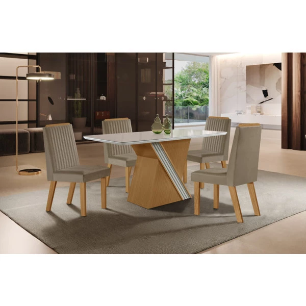 O Conjunto de jantar em MDF 4 lugares Bella é moderno e lindo, com ele qualquer ambiente fica chique e prazeroso. As Cadeiras possuem encostos no formato anatômico e detalhe em MDF acima do encosto estofado. A Mesa conta com tampo de acabamento UV e vidro serigrafado / temperado de 4mm, que traz mais durabilidade para seu produto.