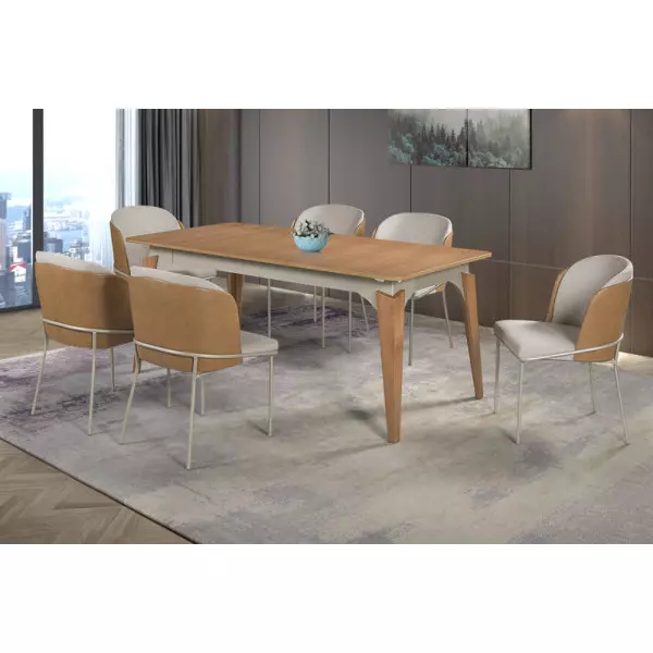 Um conjunto luxuoso e sofisticado para deixar sua casa muito elegante. O conjunto Vitória, composto pela mesa Vitória que tem a base em madeira maciça envernizada com chapa de aço carbono com pintura epóxi e tampo em MDF de 15mm laminado, e pelas cadeiras Aurora que possuem a estrutura em aço carbono, encosto em MDF e assento com espuma D-28 trazendo um estilo moderno e conforto para o seu ambiente não perca tempo garanta já o seu conjunto e renove sua casa!
